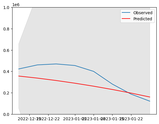# Plot predictions and fill between the upper and lower bounds of the confidence interval