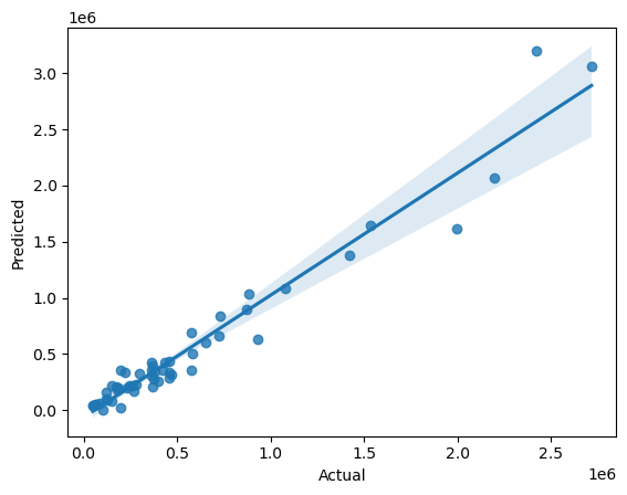 sns.regplot(x='Actual', y='Predicted', data=df_predict)