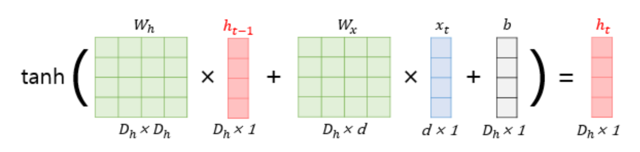수식은 생각보다 간단했다. 위에서 은닉층의 계산값이 서로 더해진다고 표현했는데, 정말로 덧셈을 진행한다. 이전 은닉층의 계산값에 대해서도 가중치가 존재하는데, 이 가중치는 특별히 다른 것이 아니고 FFNN에서도 계산하는 은닉 노드에 대한 가중치와 같은 것이다. 그리고 f는 tanh, Relu 같은 비선형 활성화 함수를 의미한다. 위에서 계산된 ht 는 다시 다음 은닉층으로 보내질 것이다. FFNN과의 차이가 더욱 명확해지는 순간이다.